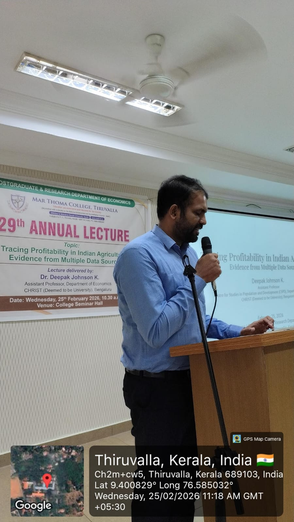 The 29th Annual Lecture of the Department was held on 25th February 2026 at the College Seminar Hall. Principal Dr. Mathew Varkey T K presided over the meeting. Dr. Deepak Johnson K, Assistant Professor, Department of Economics, CHRIST (Deemed to be University), Bengaluru delivered the lecture on the topic ‘ Tracing Profitability in Indian Agriculture: Evidence from Multiple Data Sources’. Dr. Icy K John, former Principal of the College, was the moderator. During the programme, the Department also honored Dr. Anishkumar P.T., Dr. Aloshious Xavier, and Ms. Meenu S. for their academic achievements.