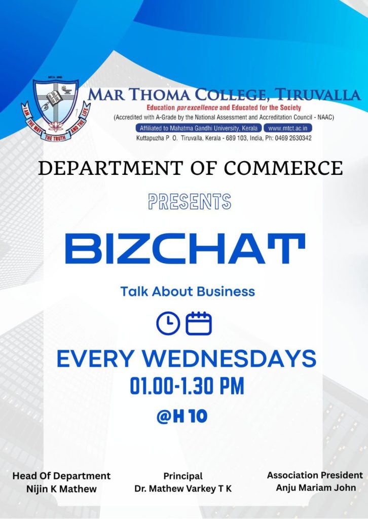 The Department has an active commerce association, which keeps on recharging students with lots of activities and programmes including curricular and extra-curricular. The association is functioning under an elected executive committee consisting of the President, Secretary, Treasurer and two class representatives from every class. The club has been successfully conducting quizzes, debates and discussions on regular basis. The commerce association notice board is serving as a good platform for students to showcase their talents and exhibit their knowledge. Commerce club is also publishing an electronic journal named “The COM-BUZ”