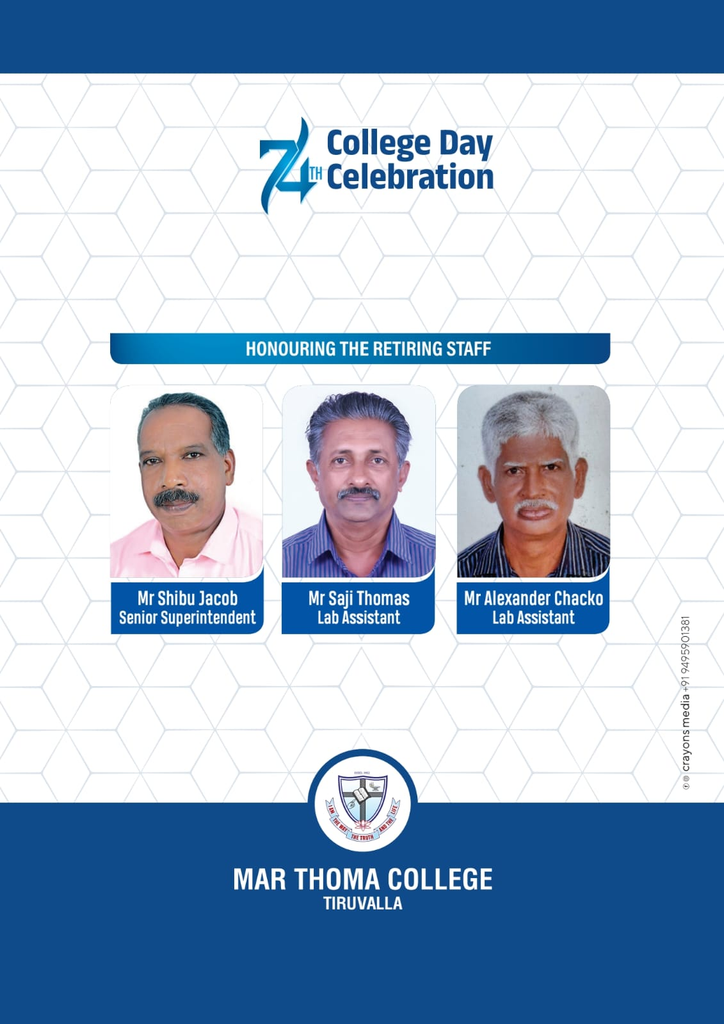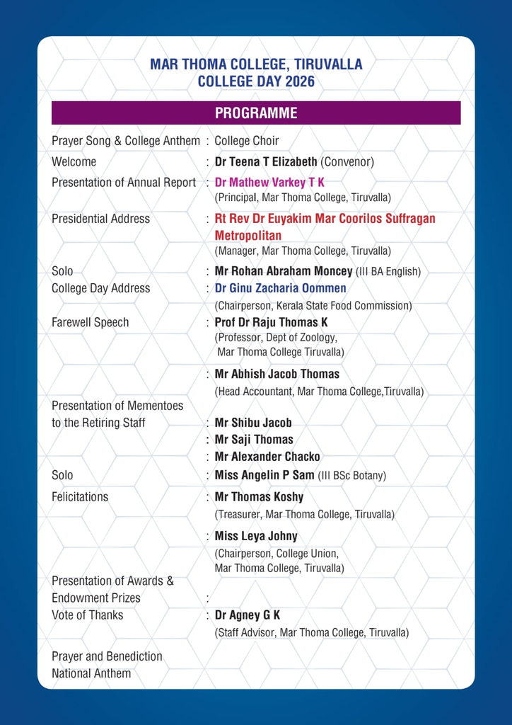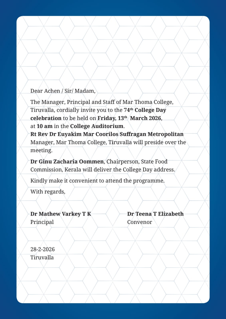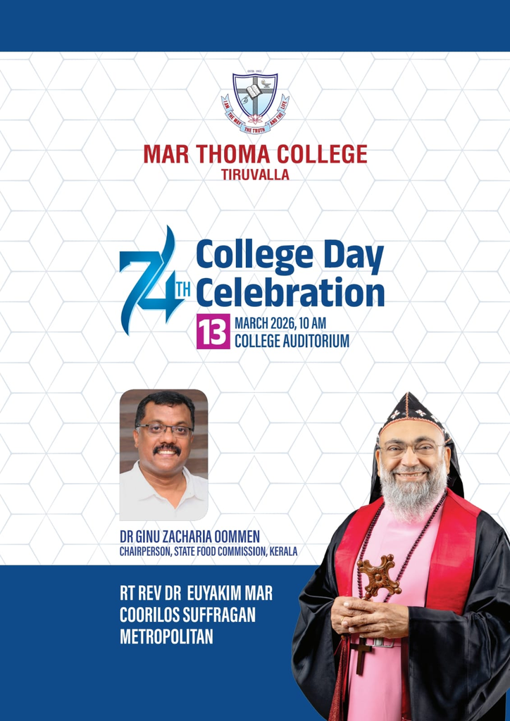 The 74th College Day Celebration will be held on Friday, 13th March, 2026 at 10 am in the College Auditorium. Rt Rev Dr Euyakim Mar Coorilos Suffragan Metropolitan, Manager, Mar Thoma College, Tiruvalla will preside over the meeting. Dr Ginu Zacharia Oommen, Chairperson, State Food Commission will be the guest of honour.