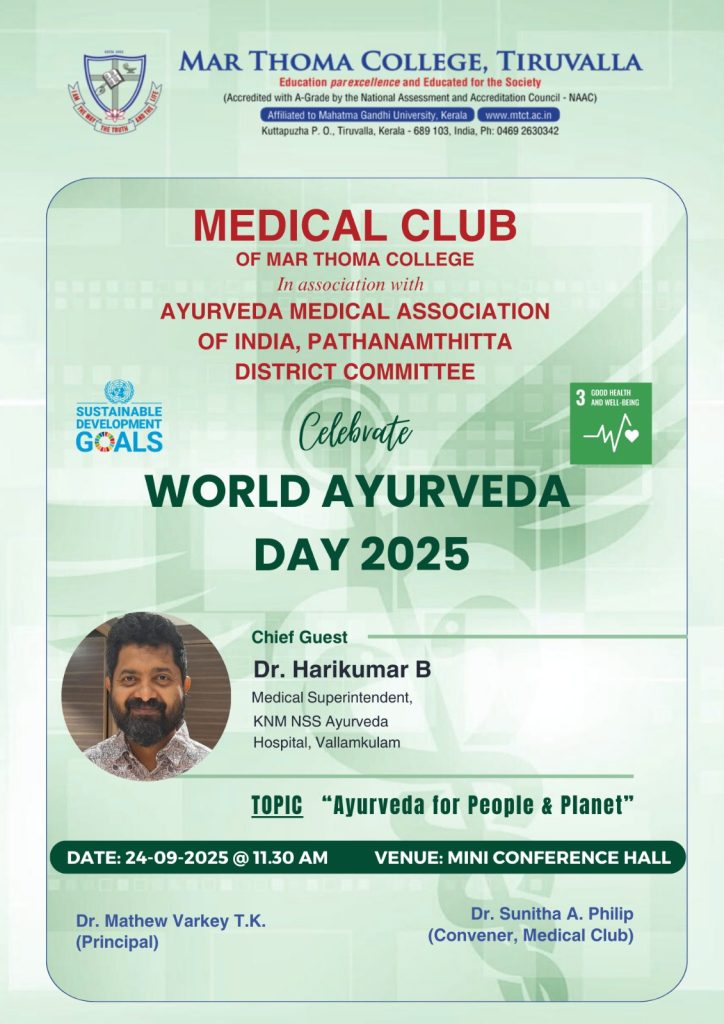 The Medical Club of Mar Thoma college, Tiruvalla is organising a health awareness Programme on 24 September 2025 at 11:30 AM in the Mini Conference Hall. The chief guest for the occasion will be Dr. Harikumar B., Medical Superintendent of KNM NSS Ayurveda Hospital, Vallamkulam. He will deliver a talk on the topic “Ayurveda for People and the Planet.”