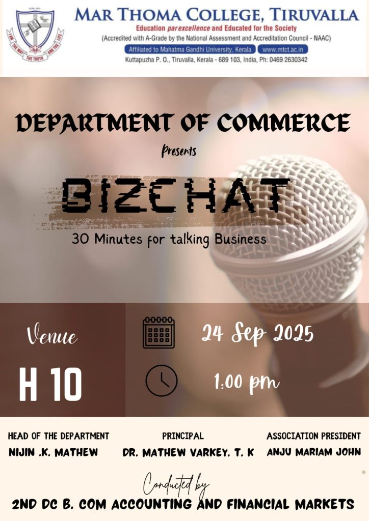 The BizChat session of the Department of Commerce will be held on September 24, 2025, at 1:00 p.m. in H10 classroom. The session will be led by the students of II BCom Accounting and Financial Markets.