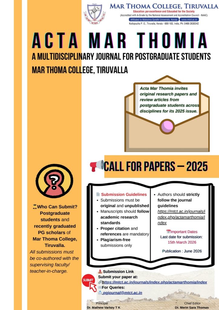 Acta Mar Thomia , a multidisciplinary journal of Mar Thoma College, Tiruvalla, invites original research papers and review articles from postgraduate students for its 2025 issue. Submissions must be original, plagiarism-free, and co-authored with the supervising faculty.