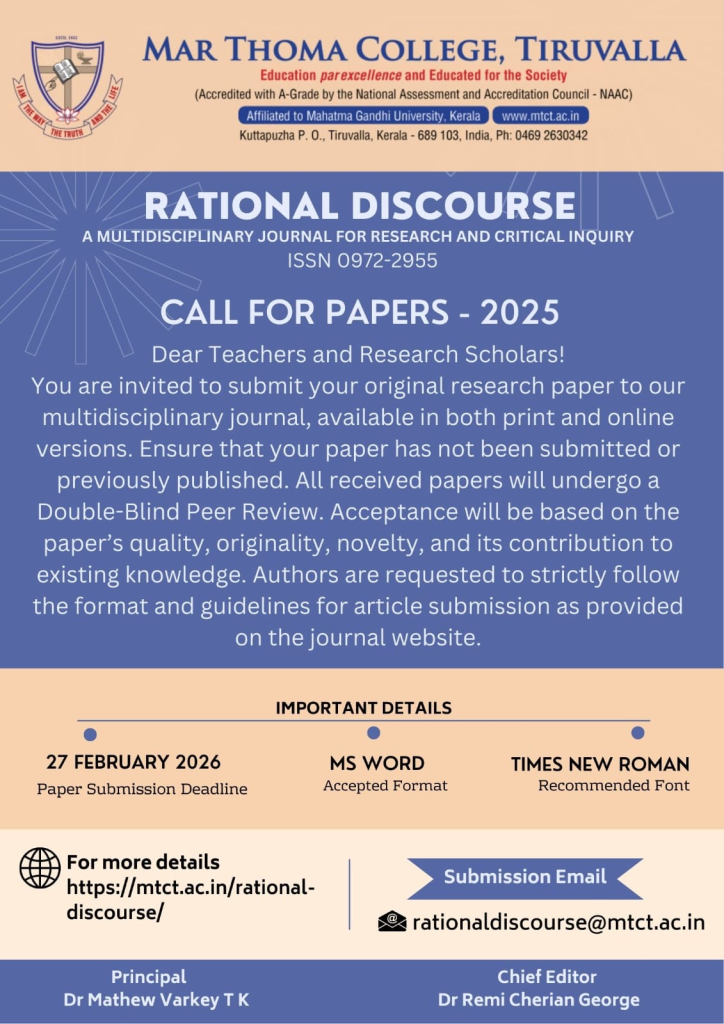 Rational Discourse (ISSN 0972-2955), the multidisciplinary research journal of Mar Thoma College, Tiruvalla, invites original and unpublished research papers from teachers and research scholars for its 2025 issue. The journal is published in both print and online formats, and all submissions will undergo a rigorous double-blind peer review based on quality, originality, and contribution to knowledge. Authors are requested to strictly follow the article format and submission guidelines available on the journal website. The last date for submission is 27 February 2026. Papers must be submitted in MS Word using Times New Roman font.