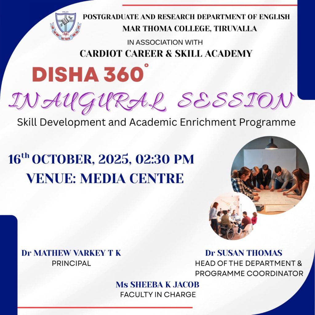 The Postgraduate and Research Department of English in association with Cardiot Academy Tiruvalla, is organising a short term course titled Disha 360°. The inaugural session of the course will be held on 16th October, 2025 at 2:30 pm in the Media Centre.