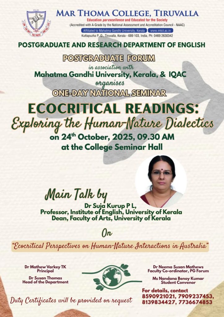 The Postgraduate and Research Department of English, Mar Thoma College, Tiruvalla, is organising a National Seminar titled, “Ecocritical Readings: Exploring the Human-Nature Dialectics” on 24th October 2025 at 9:30 AM in the College Seminar Hall.