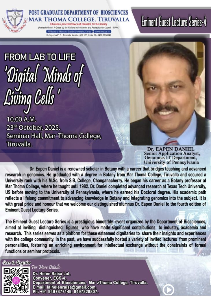 The Eminent Guest Lecture Series is a prestigious bimonthly event organized by the Department of Biosciences, aimed at inviting distinguished figures who have made significant contributions to industry, academia, and research. The fourth edition of EGS on 23rd October 2025, features an invited talk by one of our most renowned alumnus Dr. Eapen Daniel from University of Pennsylvania, US.