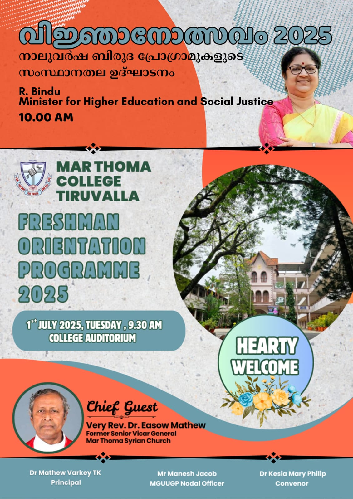 Mar Thoma College Tiruvalla is set to host its Freshman Orientation Programme for the academic year 2025-26 on July 1, 2025, at 9:30 am in the college auditorium.