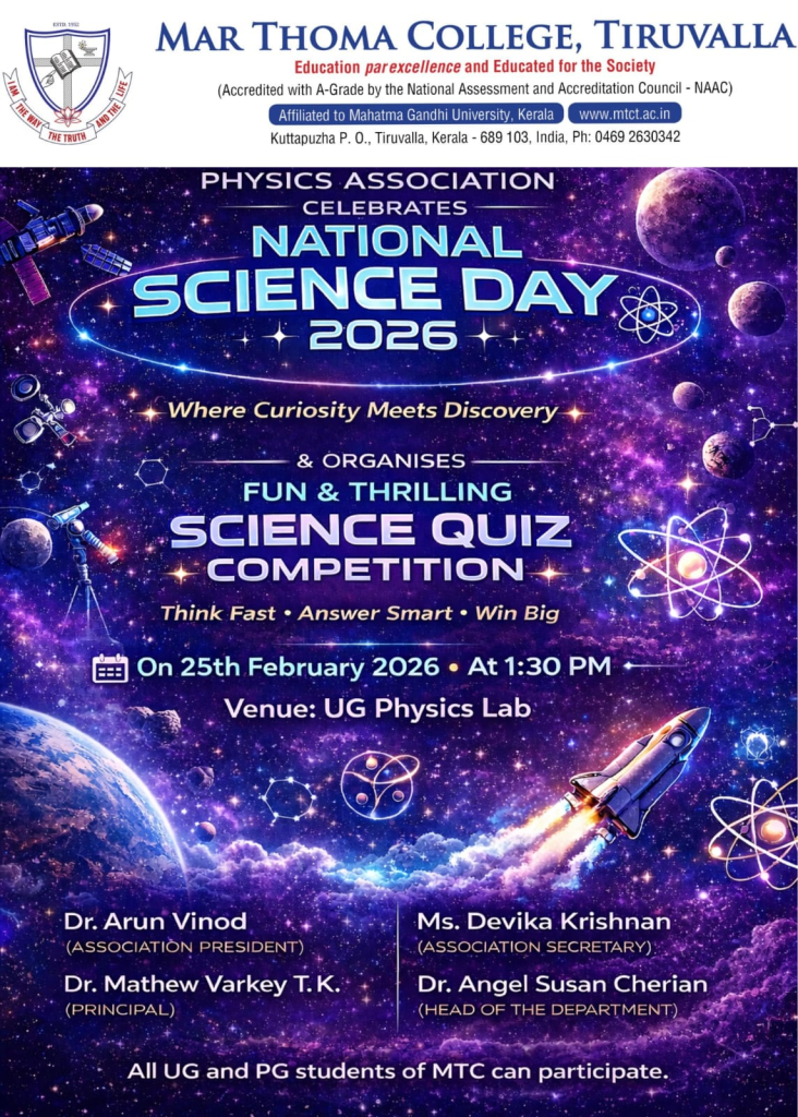 The Physics Association of Mar Thoma College, Tiruvalla, proudly celebrates National Science Day 2026 with the theme – “Where Curiosity Meets Discovery”.