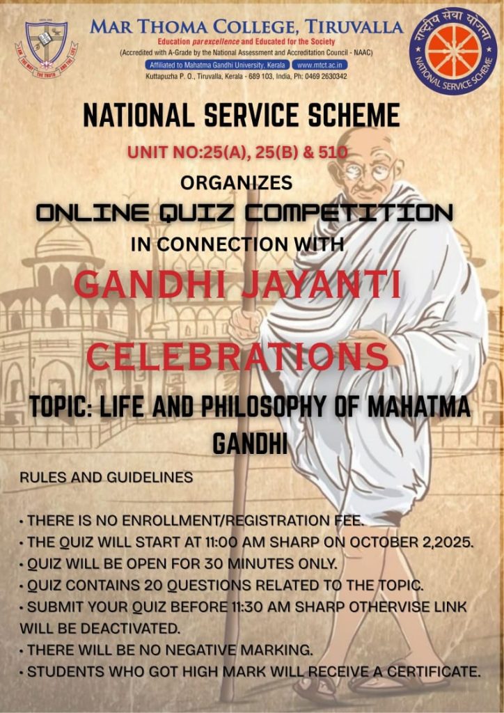The NSS units of the college organizes an online quiz for all the students of the college in connection with celebrations of Gandhi Jayanti on 2-10-25.