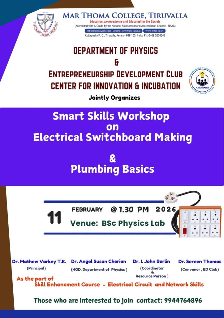 The Department of Physics and the Entrepreneurship Development Club, Center for Innovation & Incubation, are jointly organizing a Smart Skills Workshop on Electrical Switchboard Making & Plumbing Basics on 11th February 2026 at 1:30 pm in the BSc Physics Lab.