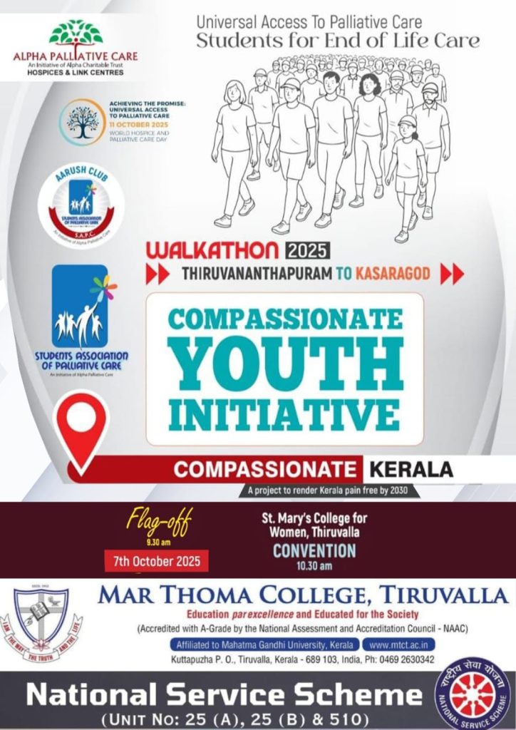 NSS units of the college in association with Alpha Palliative Care participates in Walkathon 2025 on 7-10-25 as part of Compassionate Youth Initiative, a project to render Kerala pain free, at 9.30 am at St. Mary’s College for Women Auditorium.
