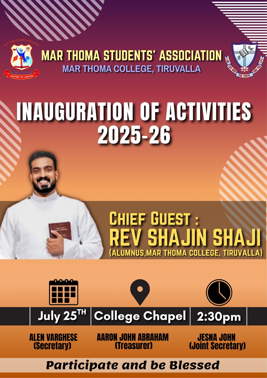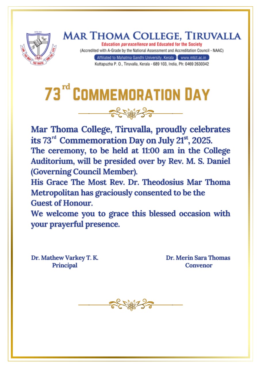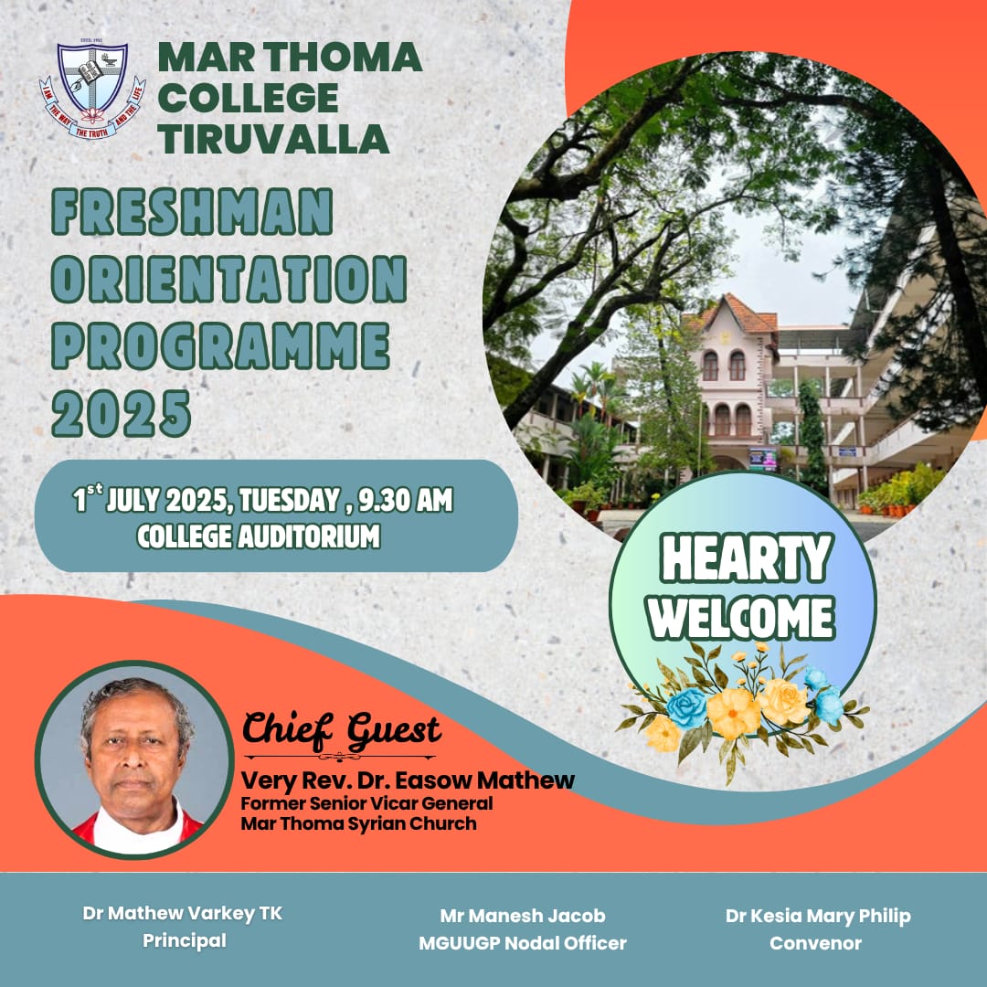 Mar Thoma College Tiruvalla is set to host its Freshman Orientation Programme for the academic year 2025-26 on July 1, 2025, at 9:30 am in the college auditorium. The programme will be graced by the presence of Very Rev. Dr. Easow Mathew, Former Senior Vicar General of the Mar Thoma Syrian Church, as the chief guest. The orientation programme aims […]