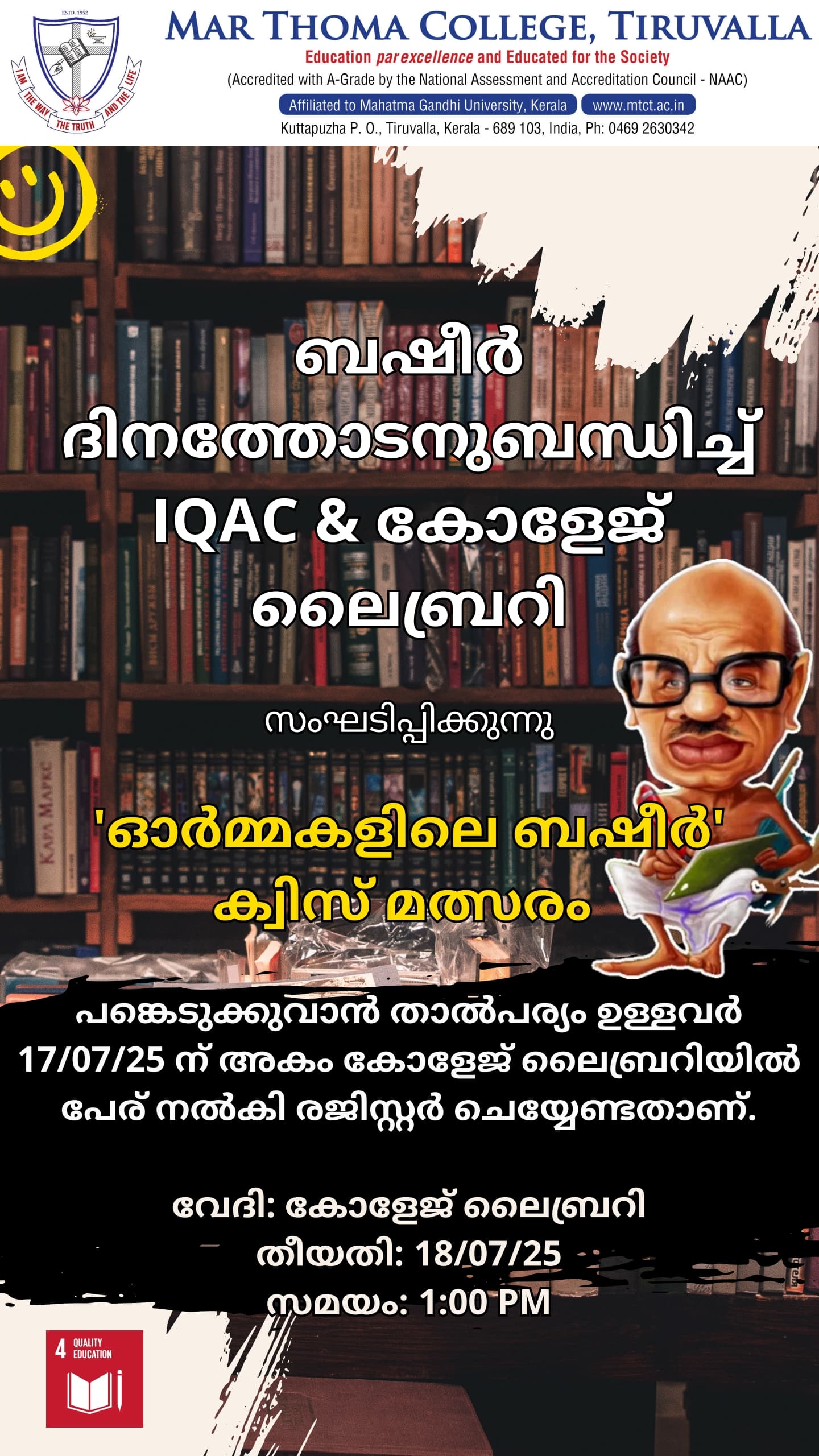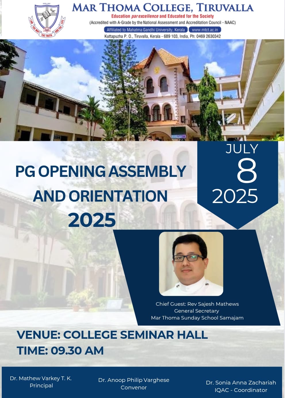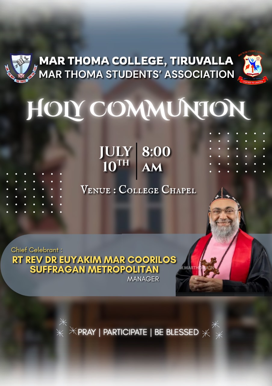Mar Thoma College Tiruvalla is set to host its Freshman Orientation Programme for the academic year 2025-26 on July 1, 2025, at 9:30 am in the college auditorium. The programme will be graced by the presence of Very Rev. Dr. Easow Mathew, Former Senior Vicar General of the Mar Thoma Syrian Church, as the chief guest. The orientation programme aims […]