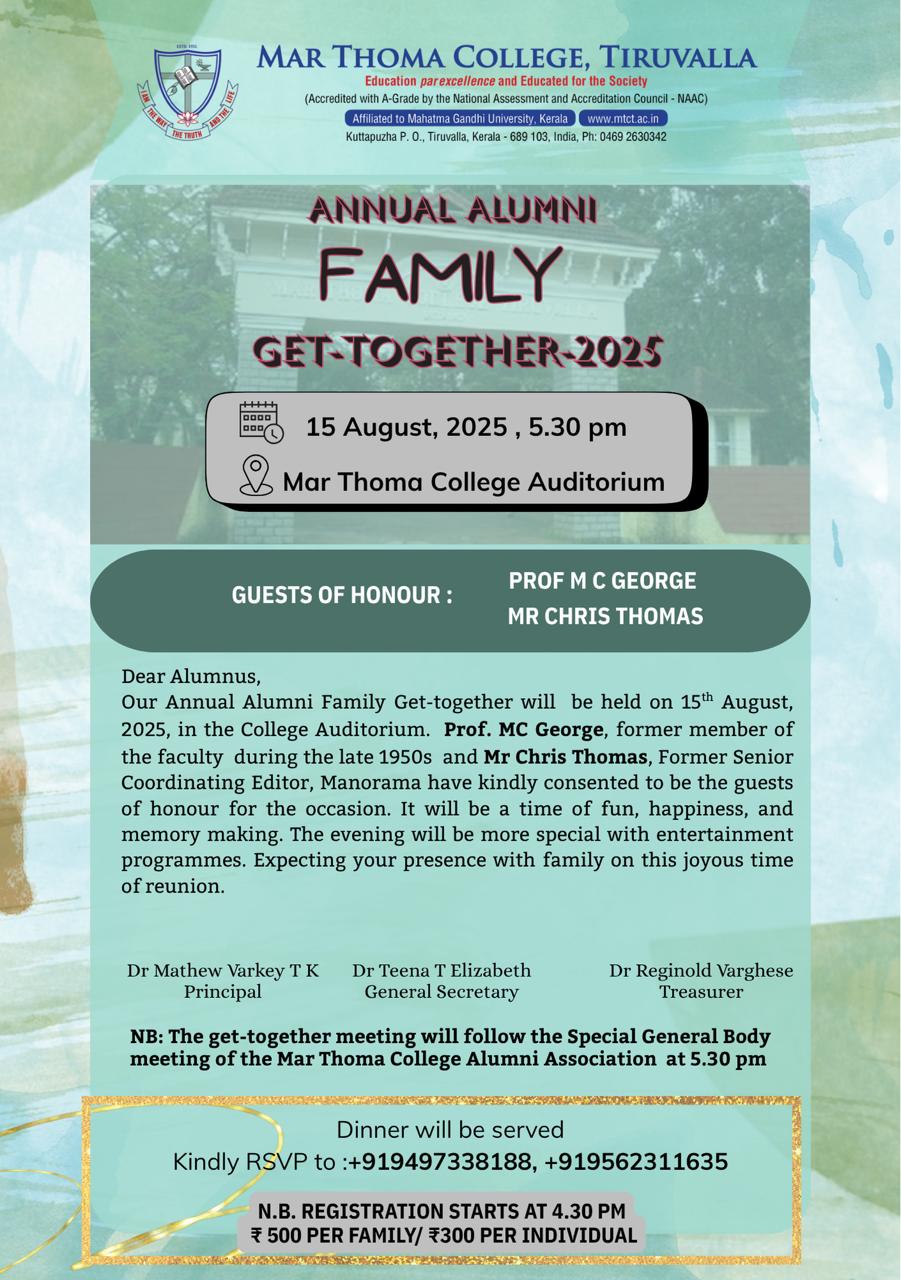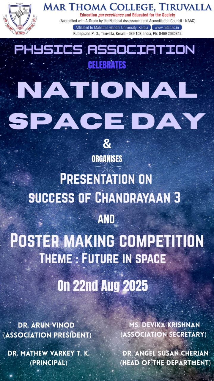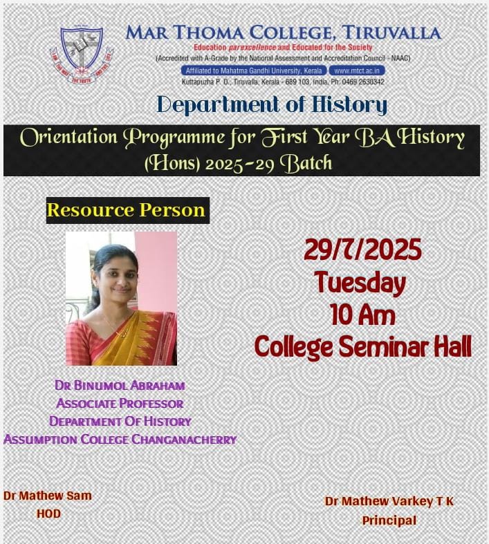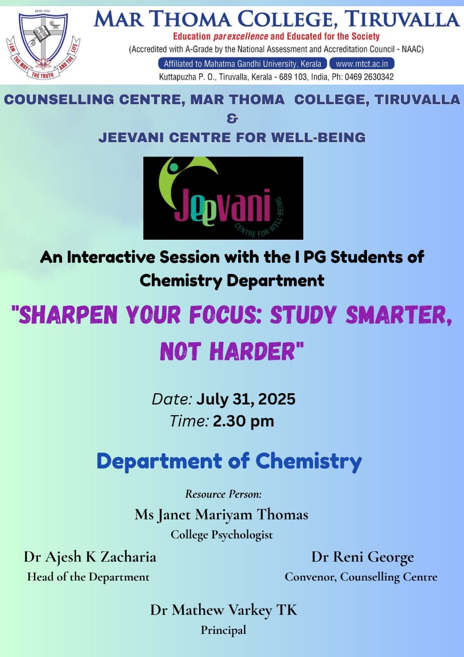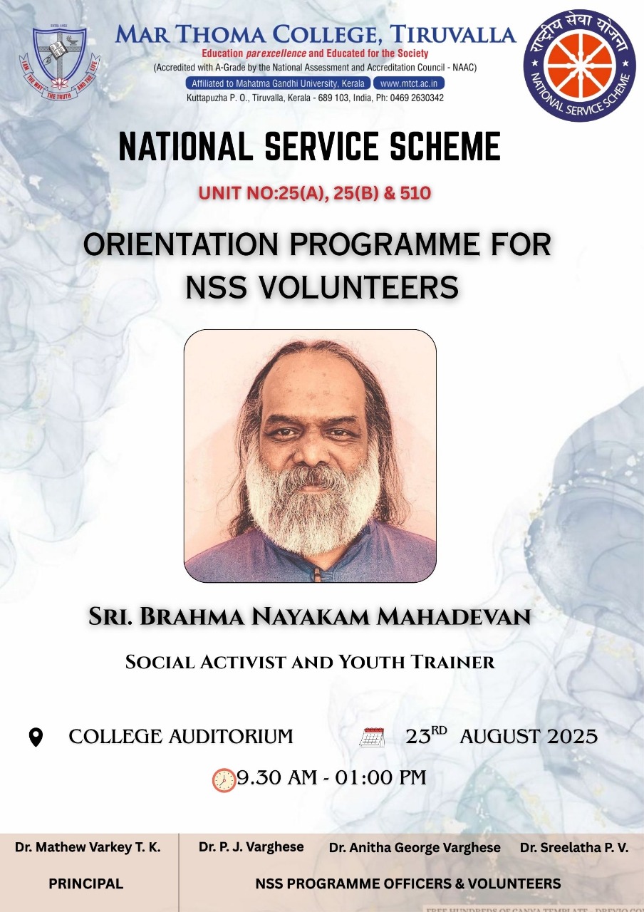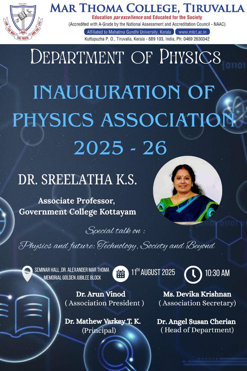 Department of Physics organises an Orientation Programme on 28th July, 2025. Time : 10.00 am. Venue: Seminar Hall, Dr. Alexander Mar Thoma Memorial Golden Jubilee Block. The main speaker is Prof. Thomas T. George, Former Faculty, Department of Physics, Mar Thoma College, Tiruvalla. There will be a Counselling session by Ms. Janet Mariam Thomas, Jeevani Centre for wellbeing, Department of […]