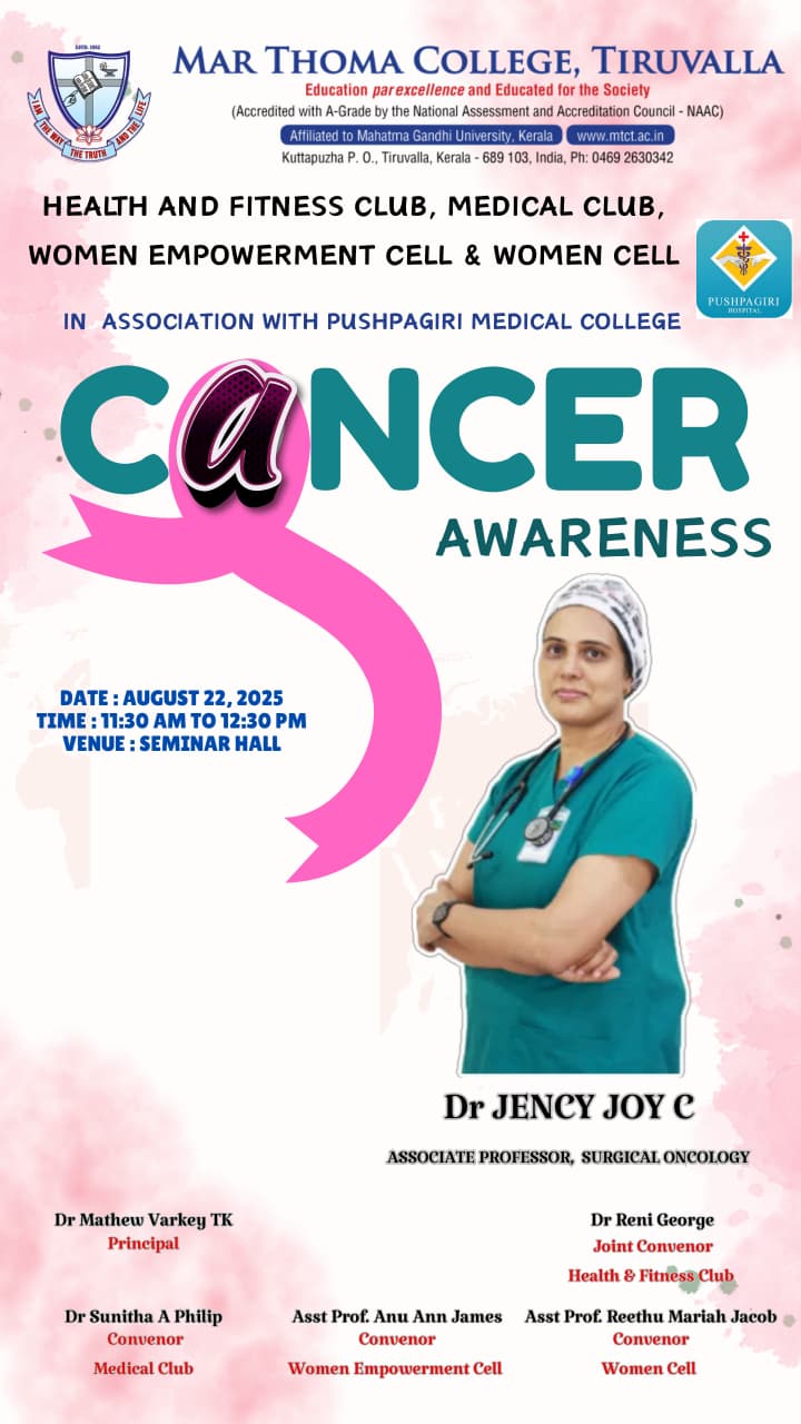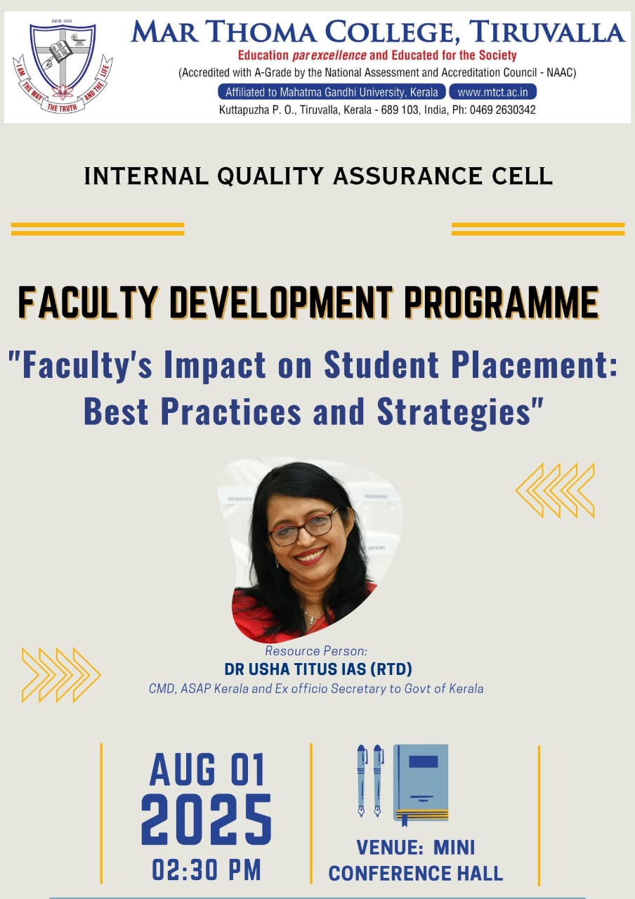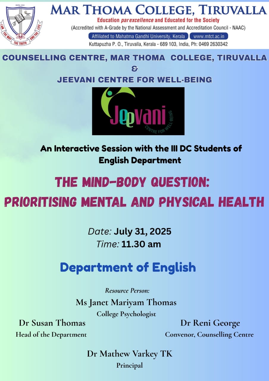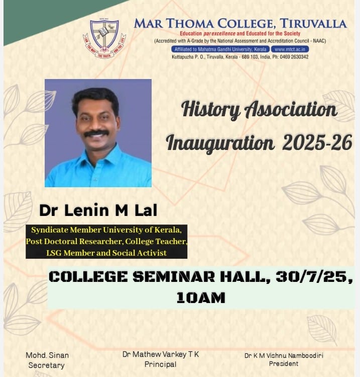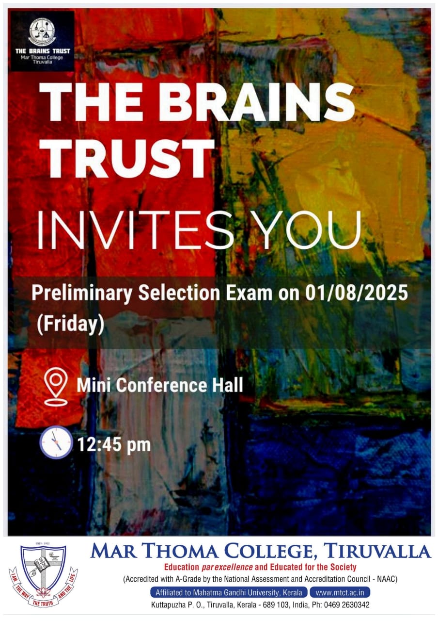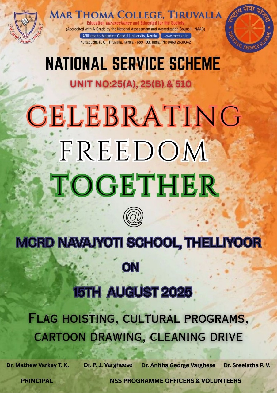 Department of Physics organises an Orientation Programme on 28th July, 2025. Time : 10.00 am. Venue: Seminar Hall, Dr. Alexander Mar Thoma Memorial Golden Jubilee Block. The main speaker is Prof. Thomas T. George, Former Faculty, Department of Physics, Mar Thoma College, Tiruvalla. There will be a Counselling session by Ms. Janet Mariam Thomas, Jeevani Centre for wellbeing, Department of […]
