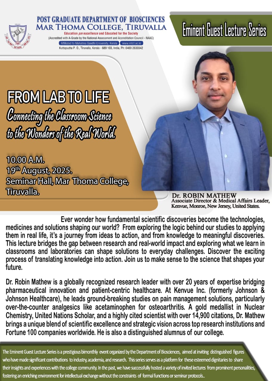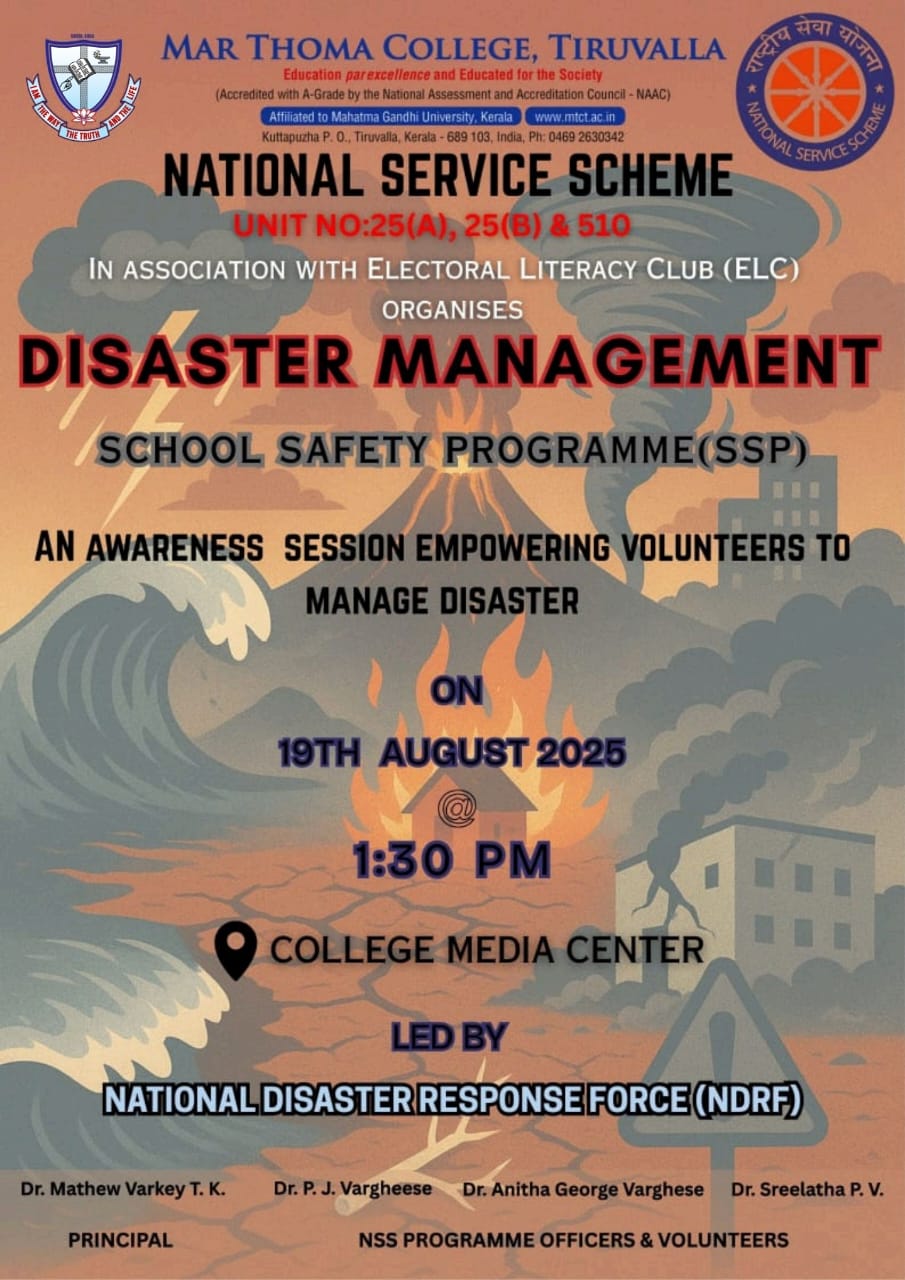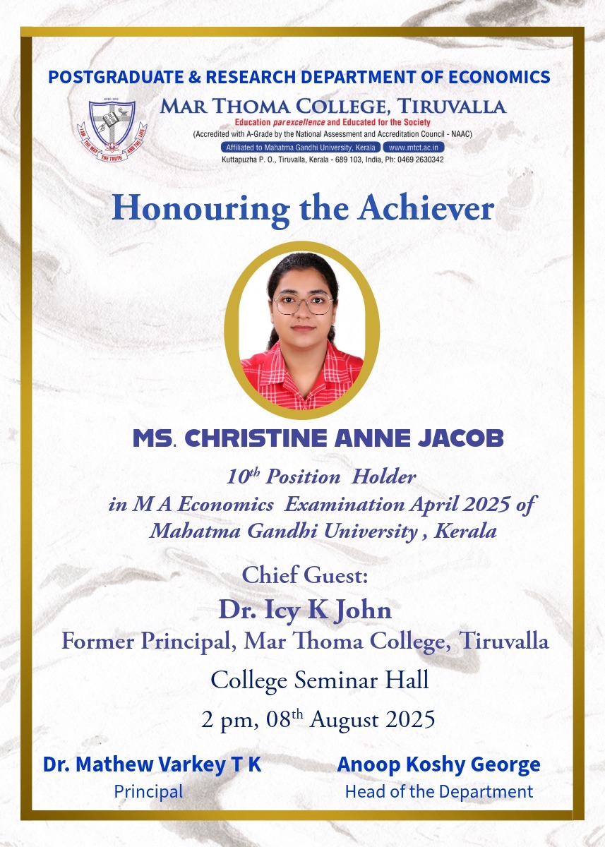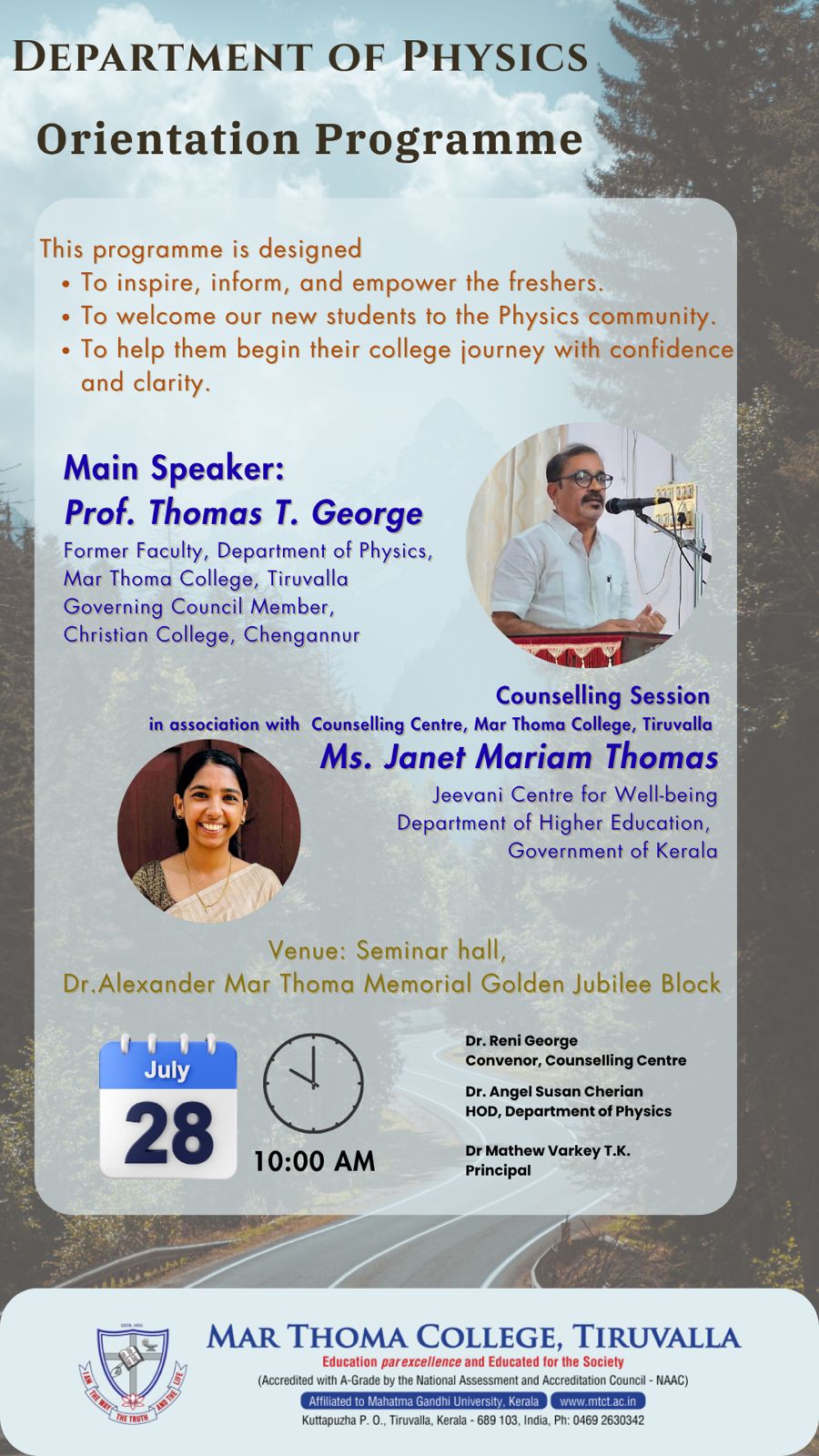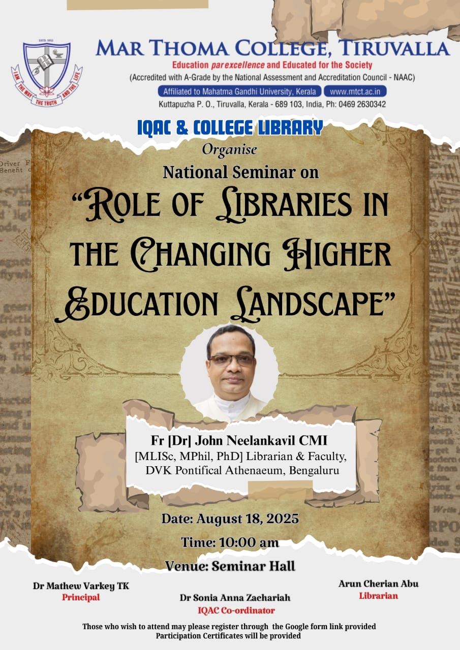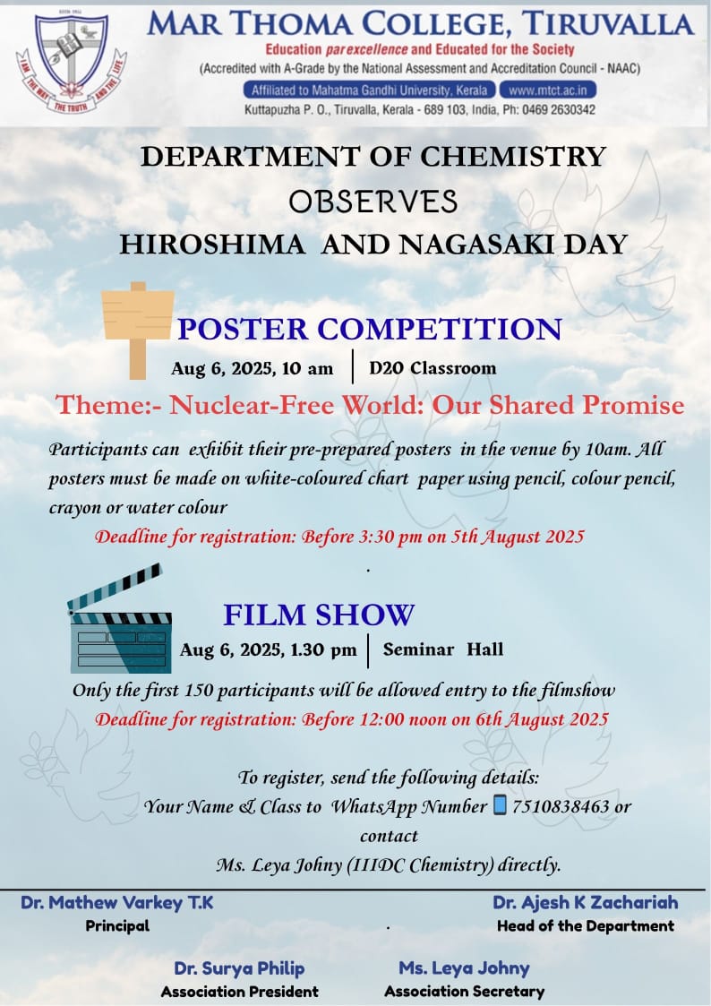 Department of Physics organises an Orientation Programme on 28th July, 2025. Time : 10.00 am. Venue: Seminar Hall, Dr. Alexander Mar Thoma Memorial Golden Jubilee Block. The main speaker is Prof. Thomas T. George, Former Faculty, Department of Physics, Mar Thoma College, Tiruvalla. There will be a Counselling session by Ms. Janet Mariam Thomas, Jeevani Centre for wellbeing, Department of […]