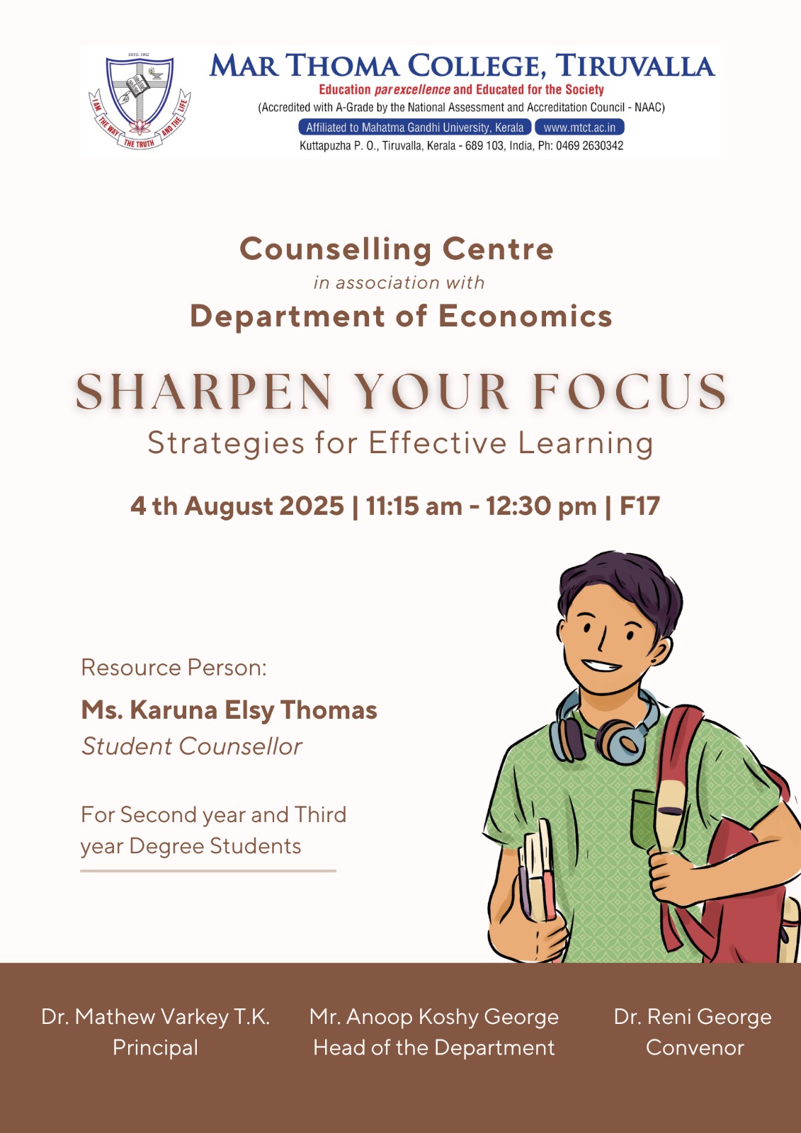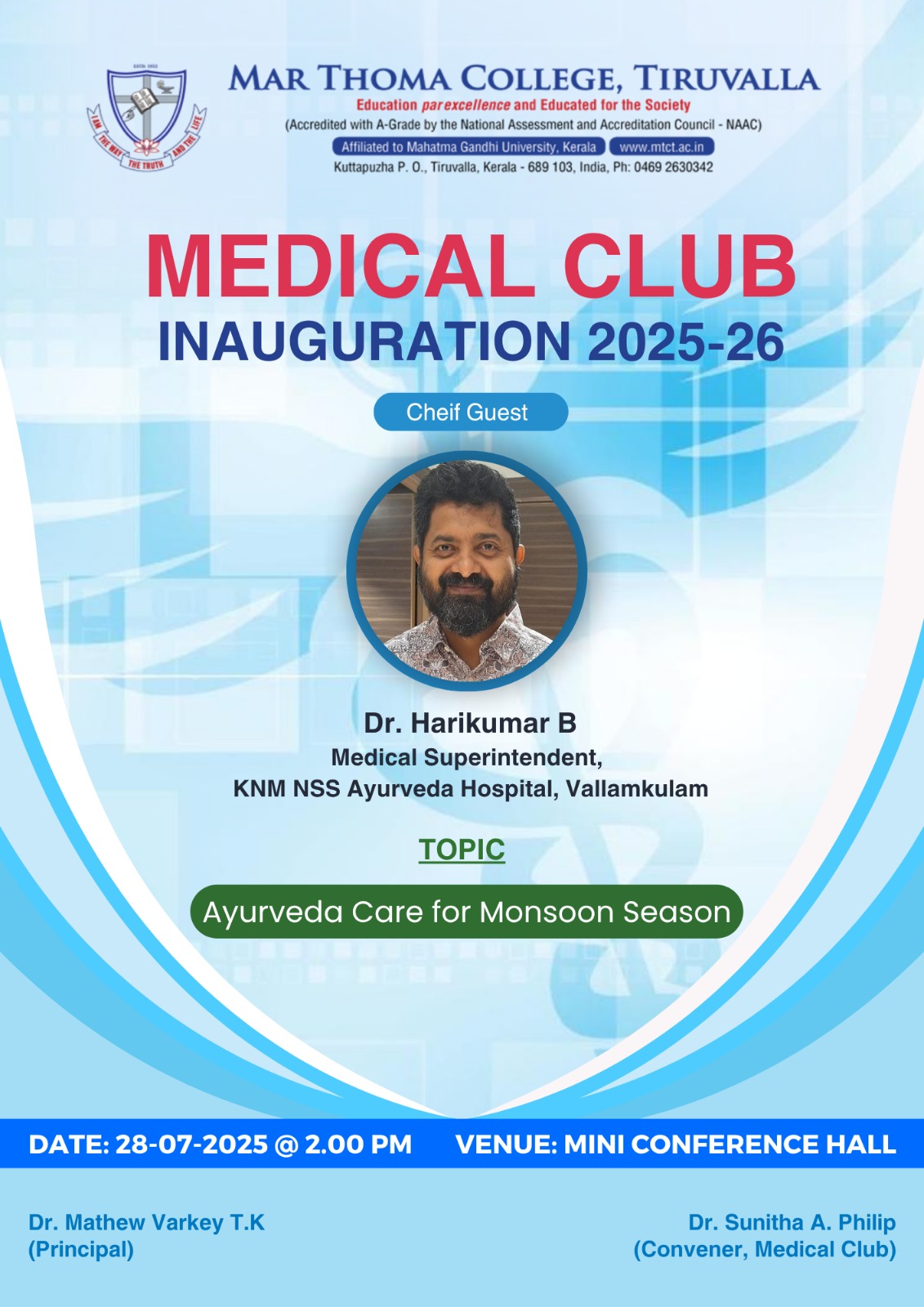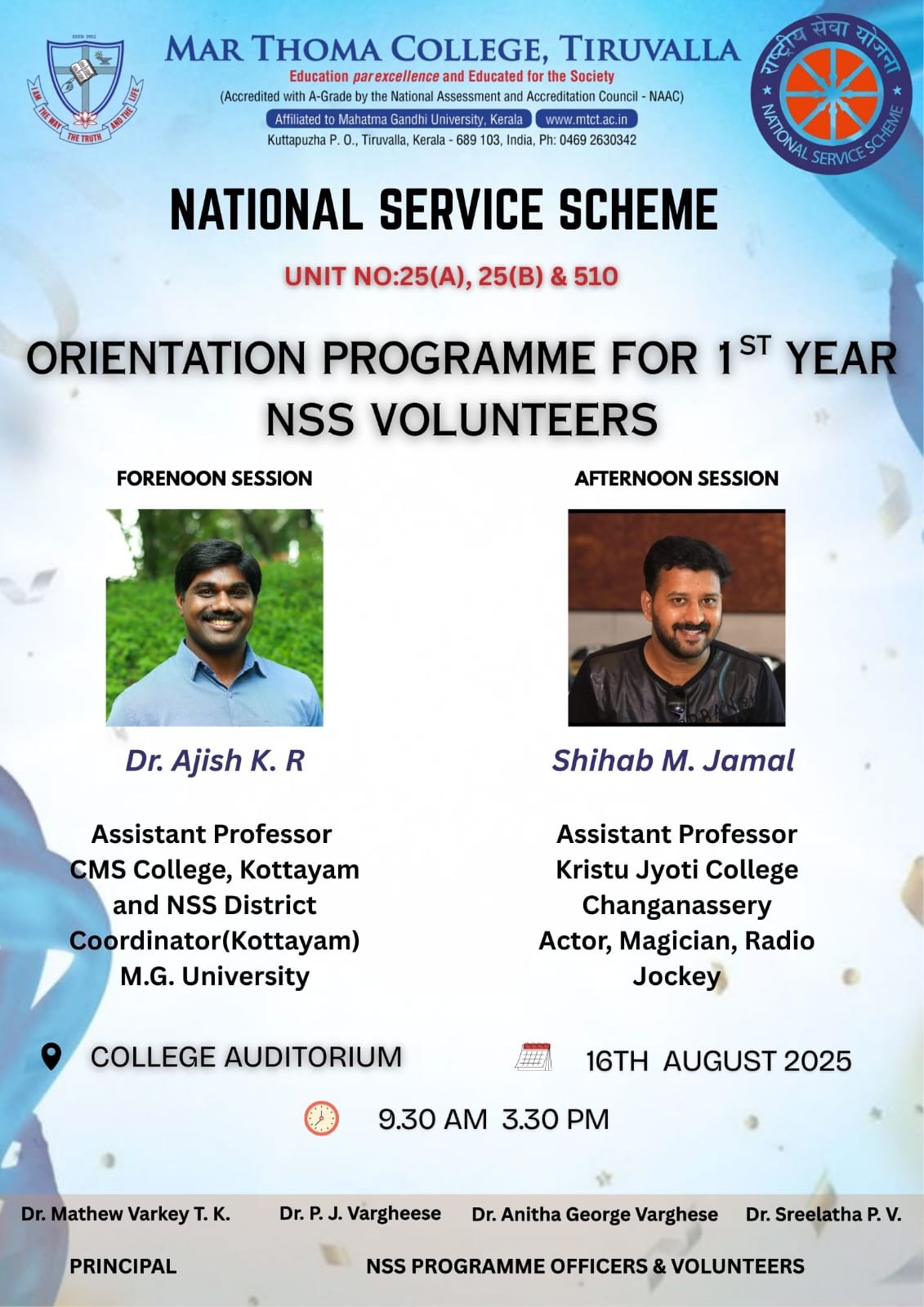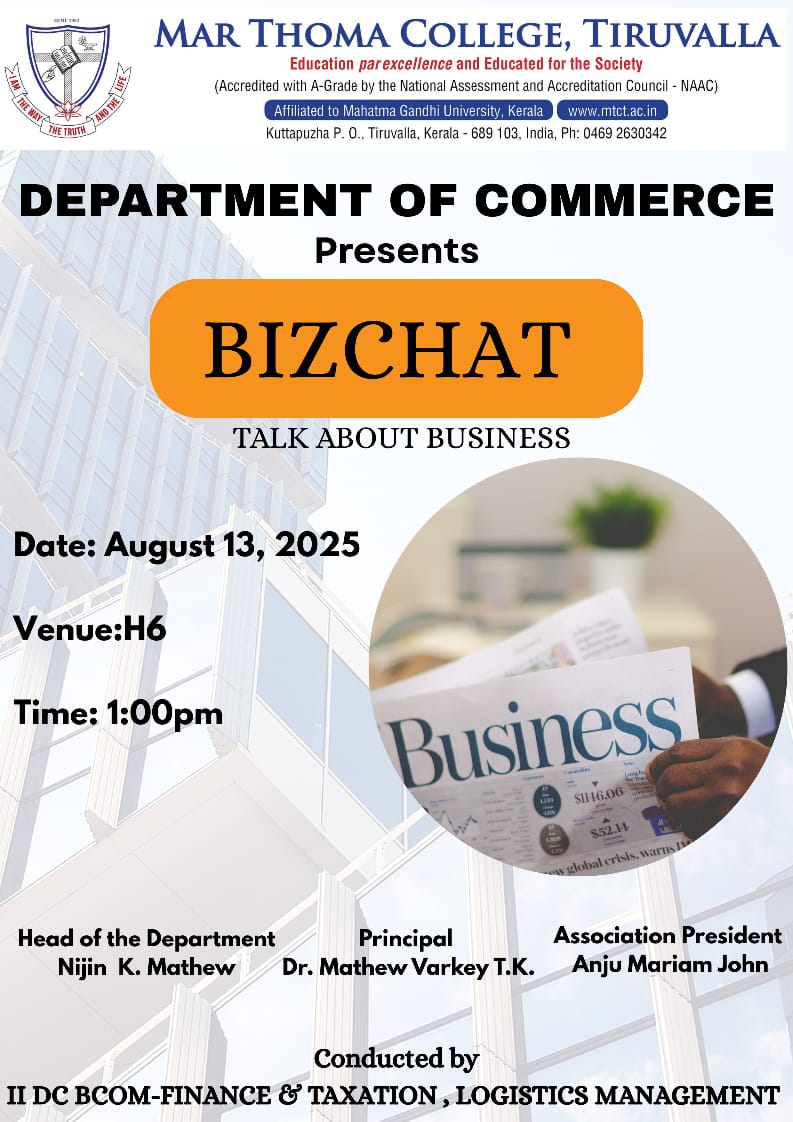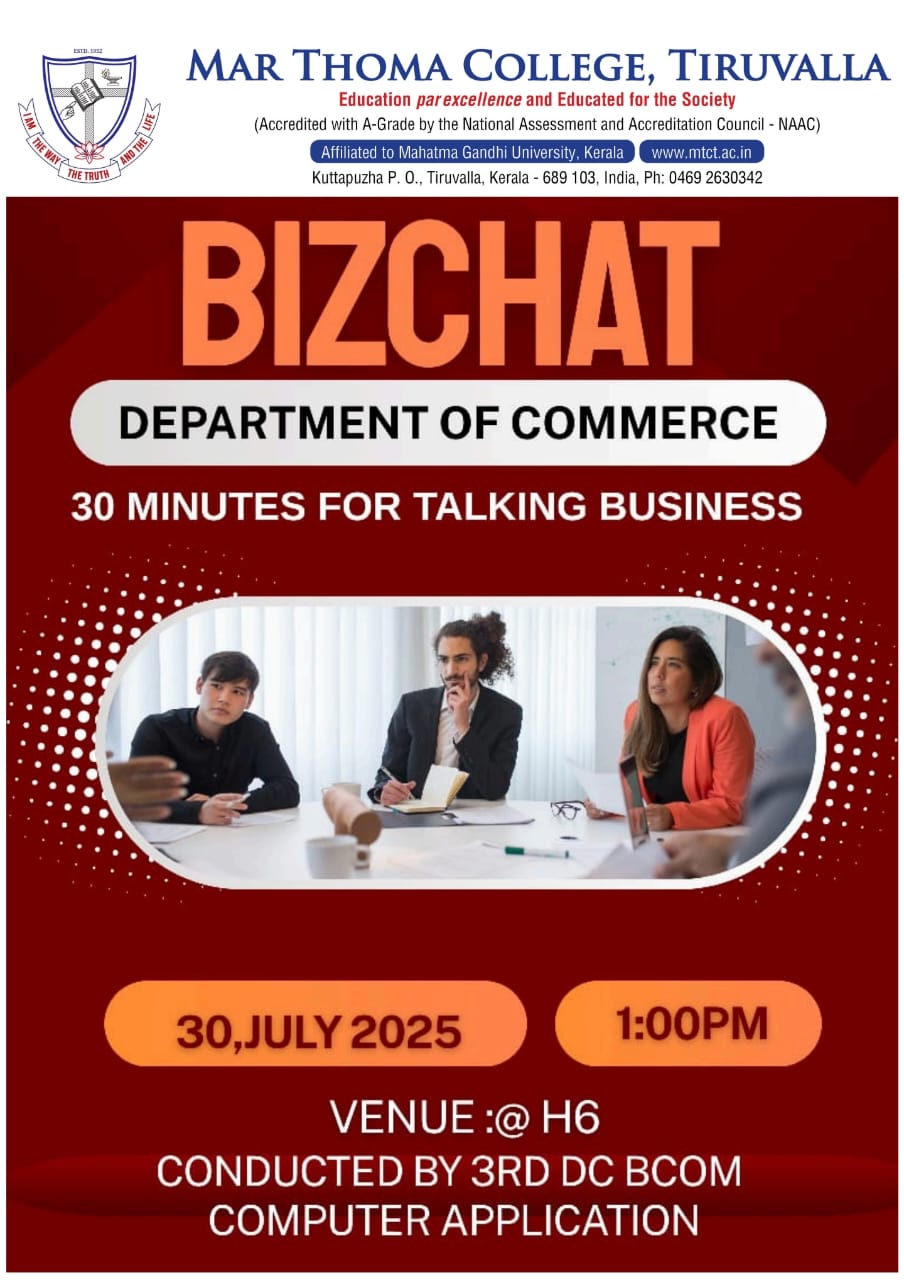 Department of Physics organises an Orientation Programme on 28th July, 2025. Time : 10.00 am. Venue: Seminar Hall, Dr. Alexander Mar Thoma Memorial Golden Jubilee Block. The main speaker is Prof. Thomas T. George, Former Faculty, Department of Physics, Mar Thoma College, Tiruvalla. There will be a Counselling session by Ms. Janet Mariam Thomas, Jeevani Centre for wellbeing, Department of […]