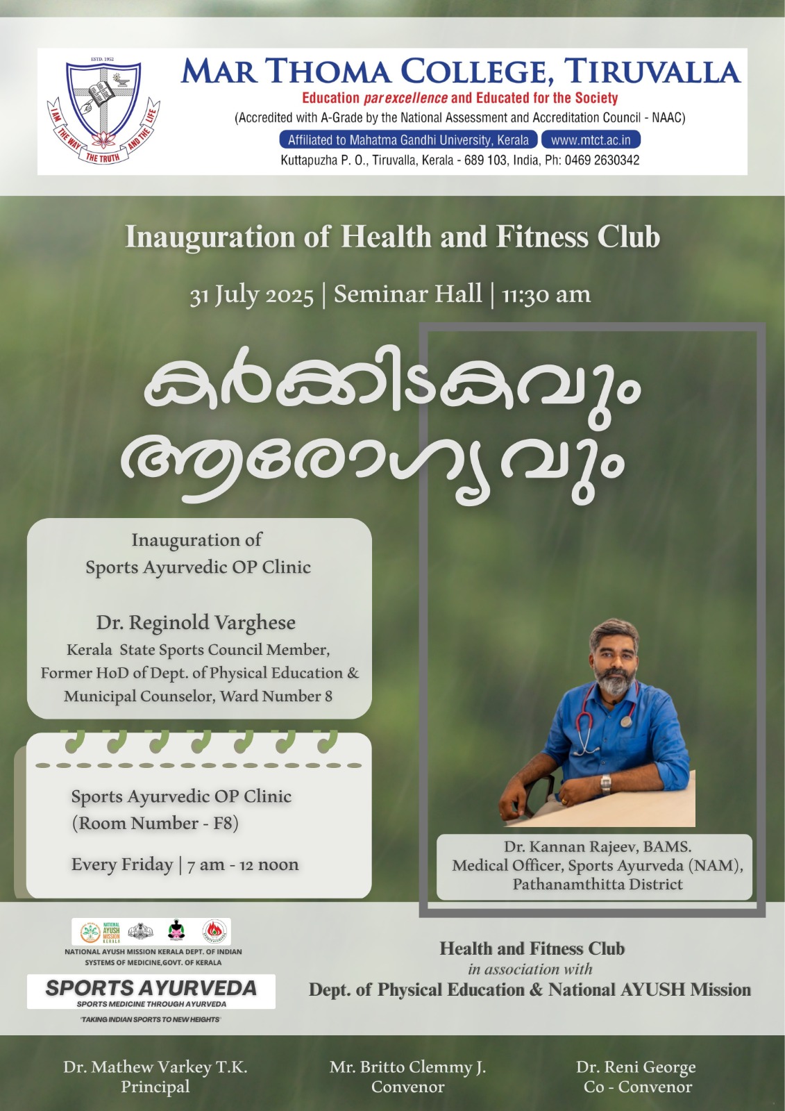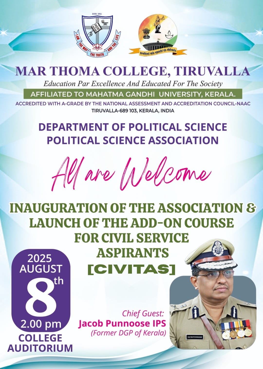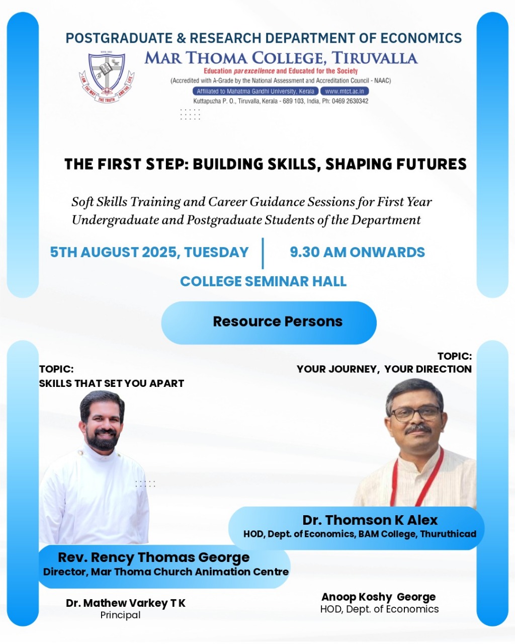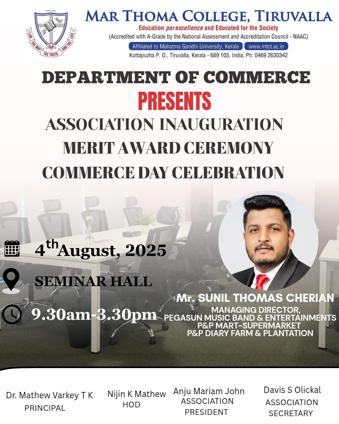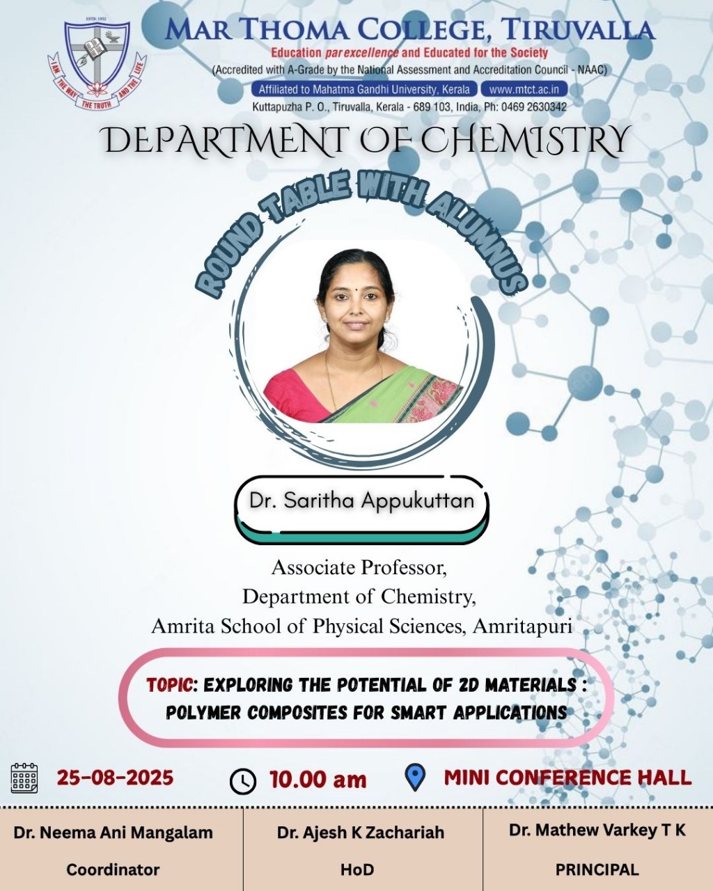 Department of Physics organises an Orientation Programme on 28th July, 2025. Time : 10.00 am. Venue: Seminar Hall, Dr. Alexander Mar Thoma Memorial Golden Jubilee Block. The main speaker is Prof. Thomas T. George, Former Faculty, Department of Physics, Mar Thoma College, Tiruvalla. There will be a Counselling session by Ms. Janet Mariam Thomas, Jeevani Centre for wellbeing, Department of […]