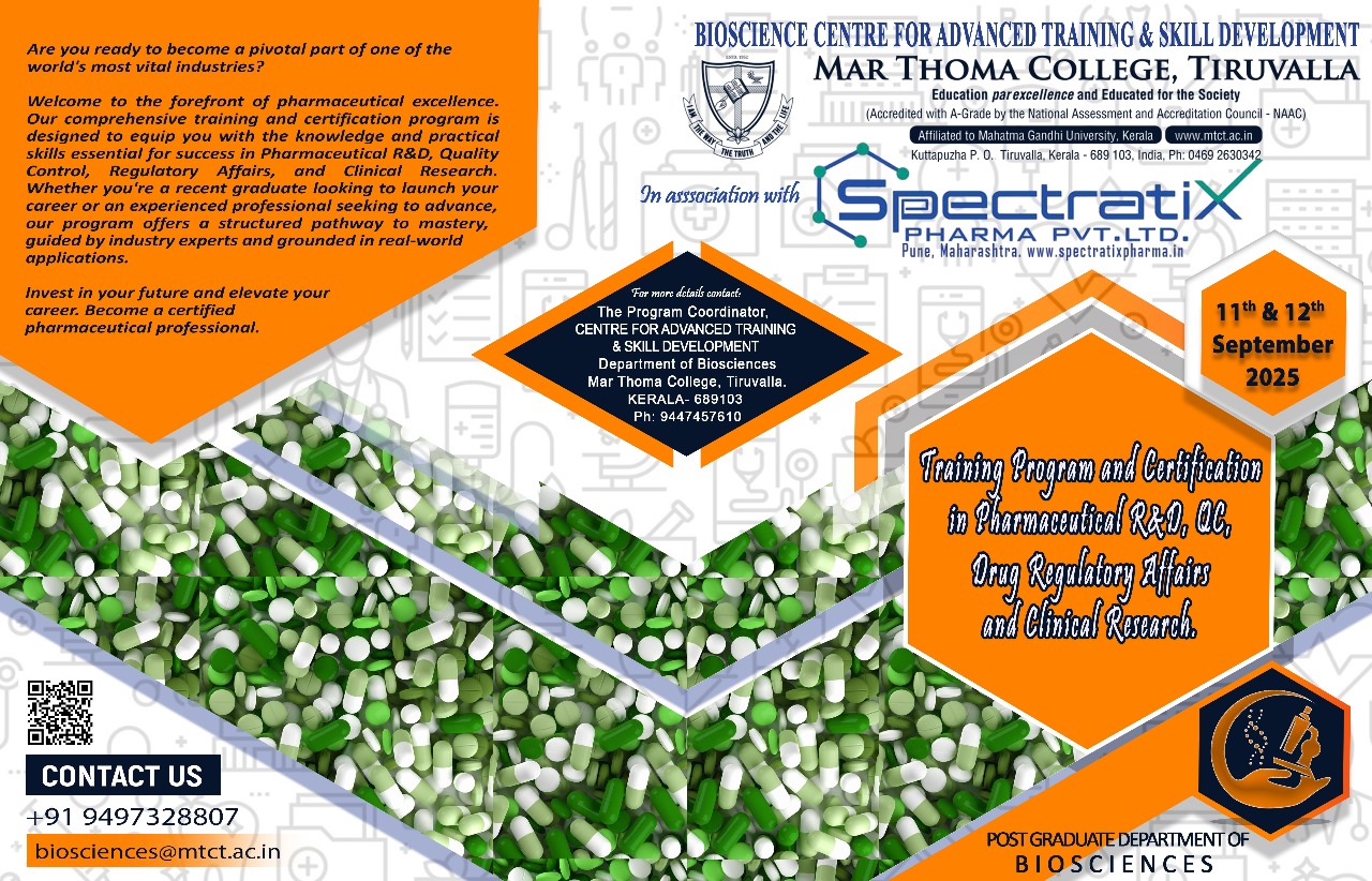 Training Program & Certification in Pharmaceutical R&D, Quality Control, Drug Regulatory Affairs, and Clinical Research at Department of Biosciences: The Centre for Advanced Training & Skill Development, Department of Biosciences, Mar Thoma College, Tiruvalla is organising a two-day Training Program & Certification in Pharmaceutical R&D, Quality Control, Drug Regulatory Affairs, and Clinical Research on 11th & 12th September 2024. This […] |