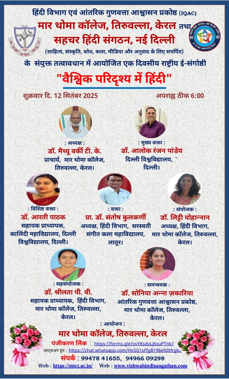 A One-Day National E-Seminar on 'Hindi in the Global Scenario' (वैश्विक परिदृश्य में हिंदी) is being jointly organized by: The Hindi Department and Internal Quality Assurance Cell (IQAC), Mar Thoma College, Tiruvalla, Kerala&Sahachar Hindi Sangathan, New Delhi Date: Friday, 12th September 2025Time: 6:00 PM The seminar will explore the significance, challenges, and opportunities of the Hindi language in the global […] |
