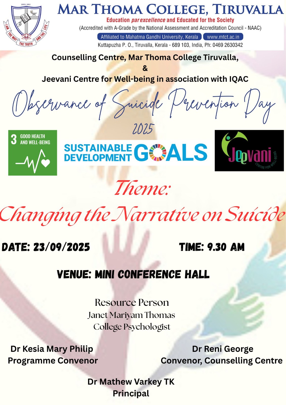 The Counselling Centre, Mar Thoma College, Tiruvalla, and Jeevani Centre for Well-being, in association with the Internal Quality Assurance Cell (IQAC), organise a counselling session on the theme 'Changing the Narrative on Suicide' on September 23, 2025, at 9:30 a.m. in the Mini Conference Hall, led by Ms. Janet Mariam Thomas, College Psychologist.