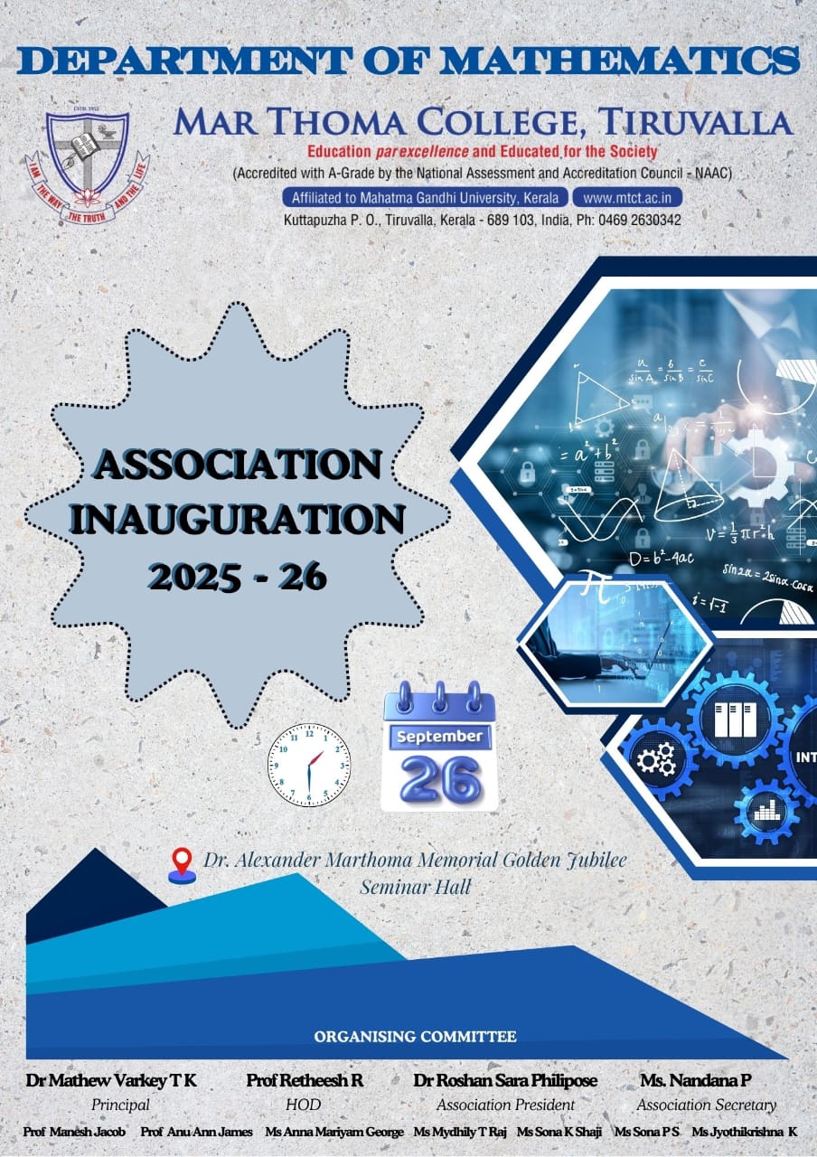 The Association inauguration of the Mathematics Department will be held on September 26, 2025, at 1:30 p.m. in the college seminar hall.