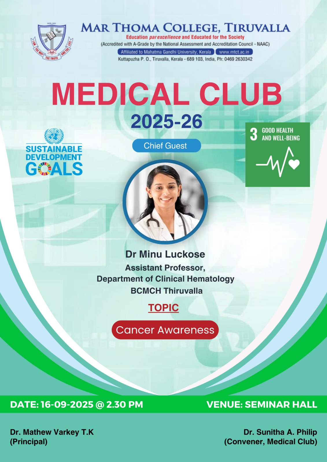 The Medical Club of Mar Thoma college, Tiruvalla is organizing a health awareness Programme on 16 September 2025 at 2:30 PM in the Seminar Hall. Dr. Minu Luckose, Assistant Professor, Department of Clinical Hematology, Believers Church Medical College Hospital, Tiruvalla, is the Chief Guest. She will deliver a talk on “Cancer Awareness” to highlight the importance of prevention and early […] |
