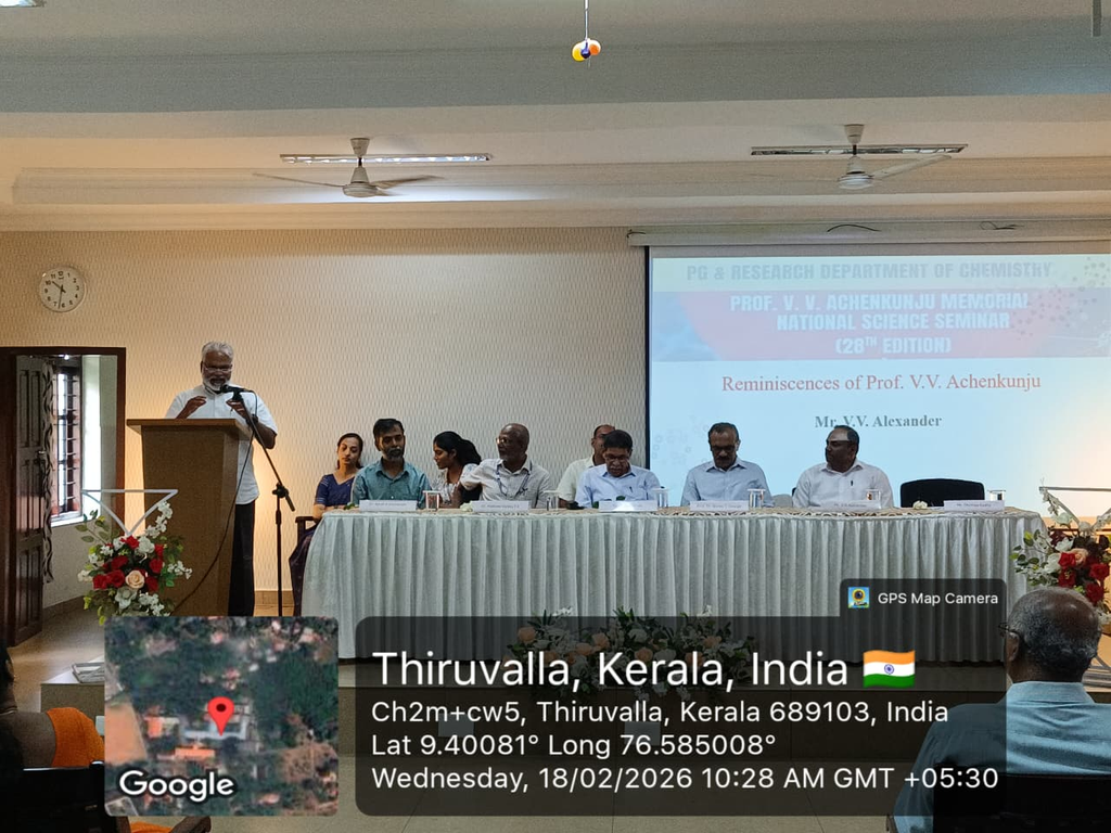 The PG and Research Department of Chemistry, Mar Thoma College, Tiruvalla, organized the 28th Edition of the Prof. V. V. Achenkunju Memorial Science Seminar & Merit Evening on 18 February 2026 at the Dr. Alexander Mar Thoma Memorial Golden Jubilee Block Seminar Hall. The seminar was conducted in loving memory of Prof. V. V. Achenkunju, whose academic legacy continues to inspire generations of students and scholars.